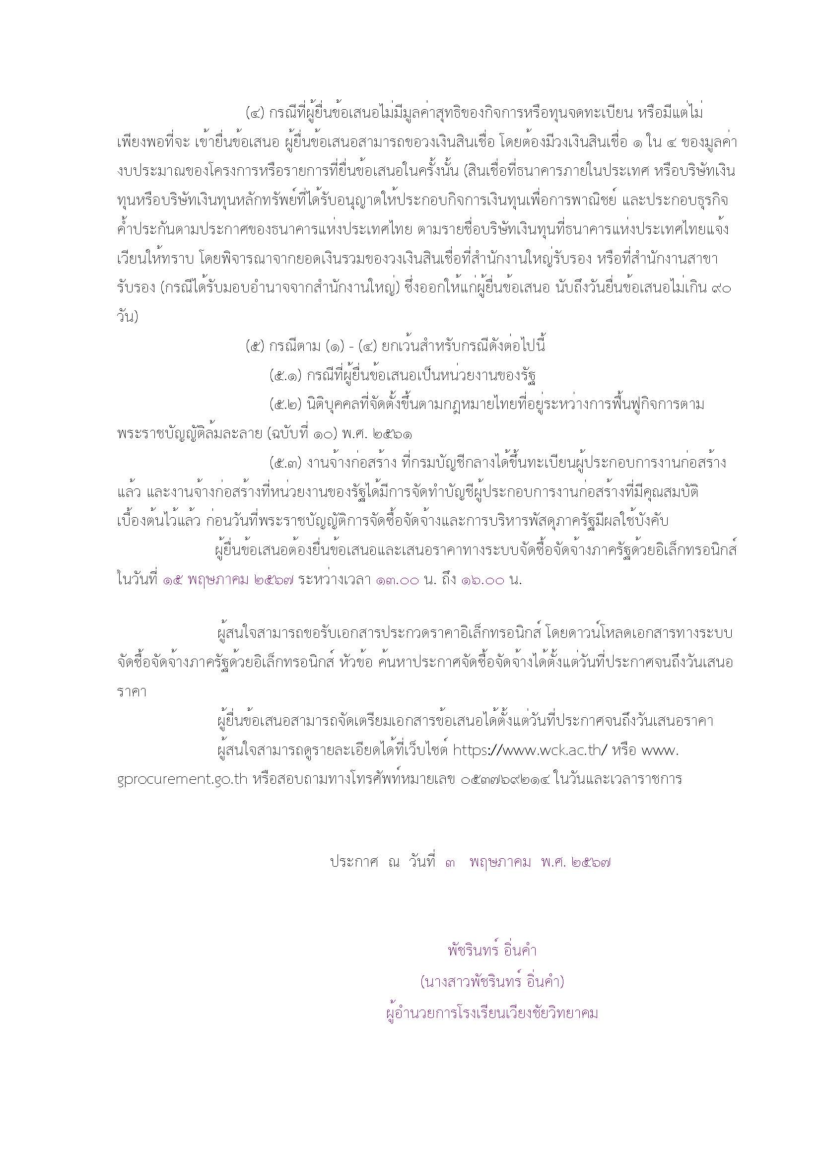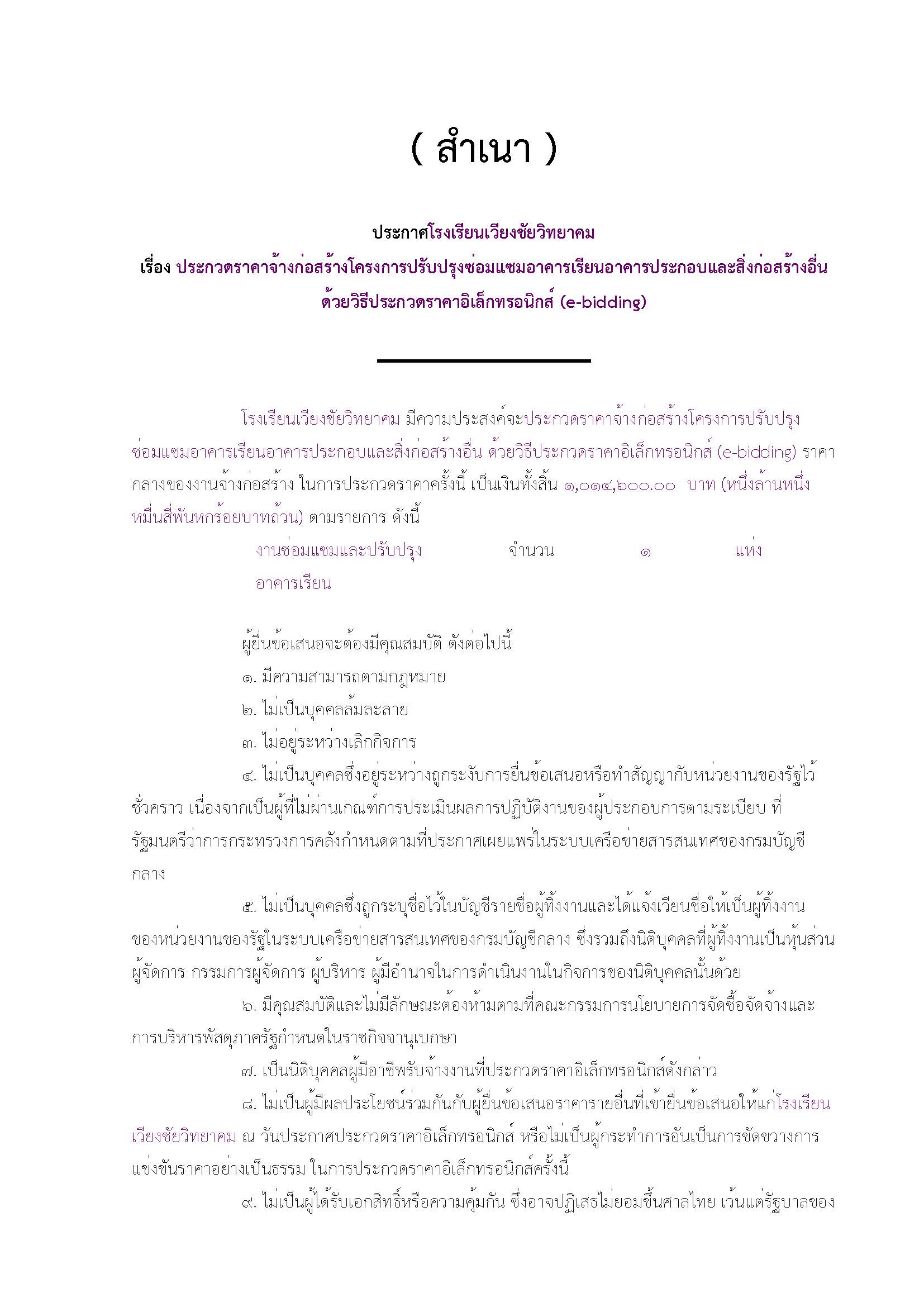 ข่าวประชาสัมพันธ์ ประกวดราคาจ้างก่อสร้างโครงการปรับปรุงซ่อมแซมอาคารเรียนอาคารประกอบและสิ่งก่อสร้างอื่น ด้วยวิธีประกวดราคาอิเล็กทรอนิกส์ (e-bidding) 3 พฤษภาคม 2024 โรงเรียนเวียงชัยวิทยาคม เอกสารประกวดราคาดาวน์โหลด